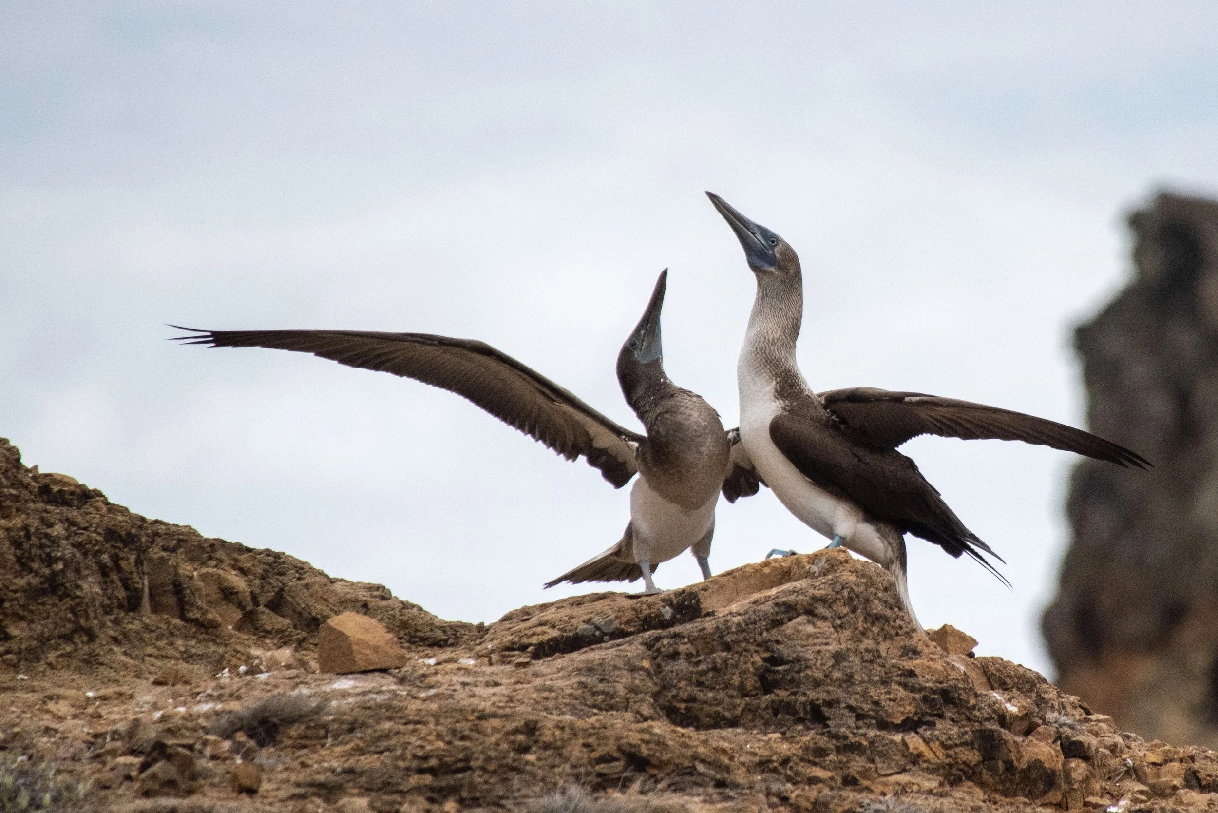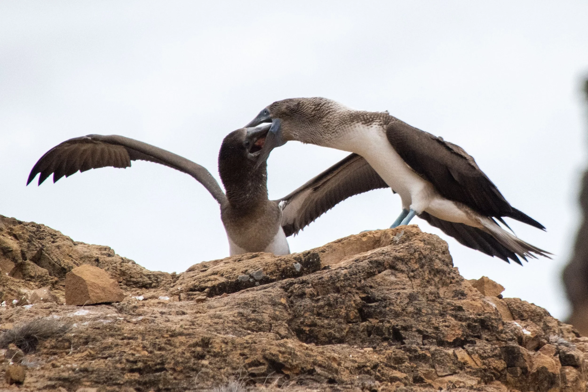 The concerned blue-footed boobies watch the frigatebird fly away.