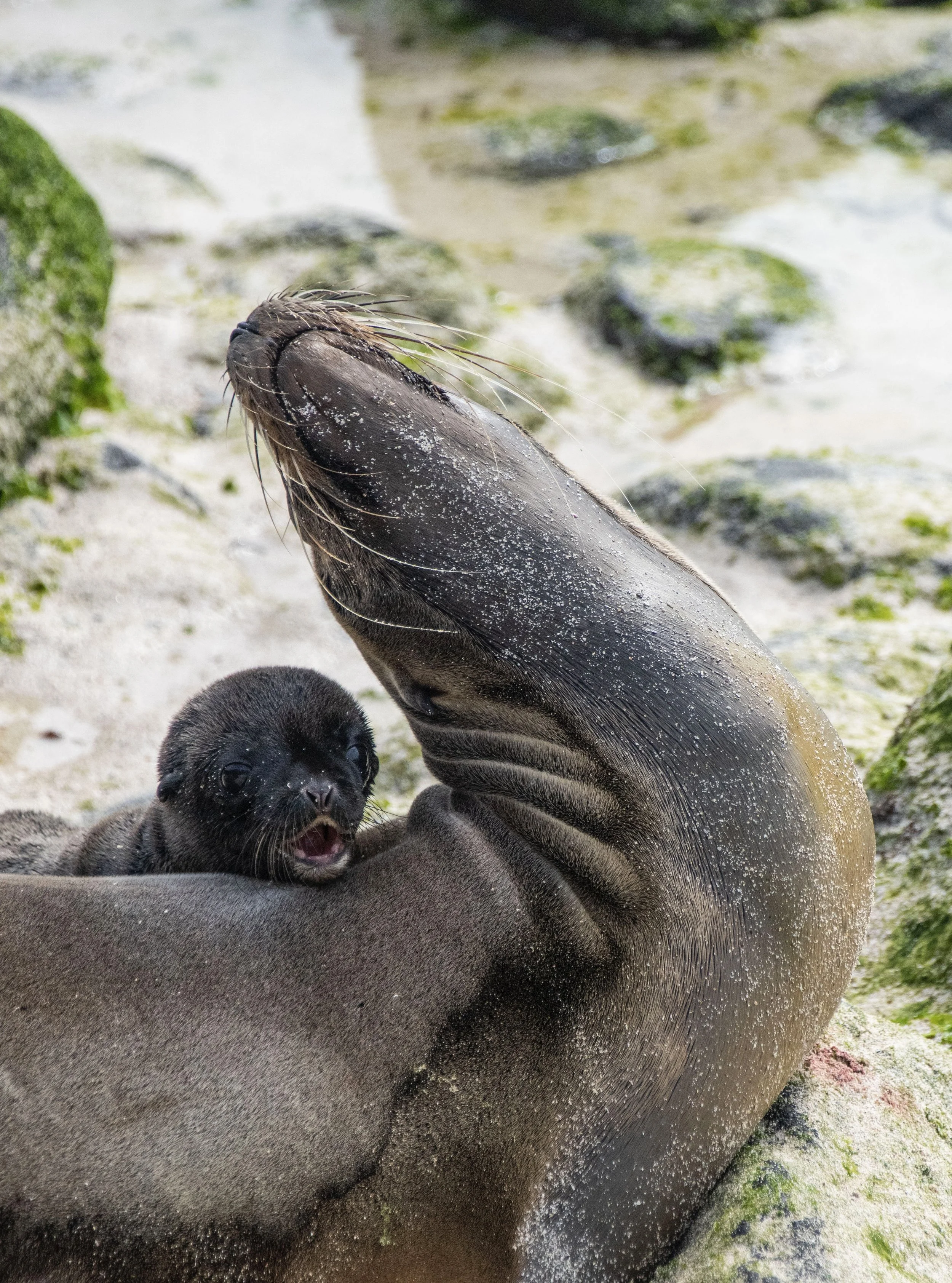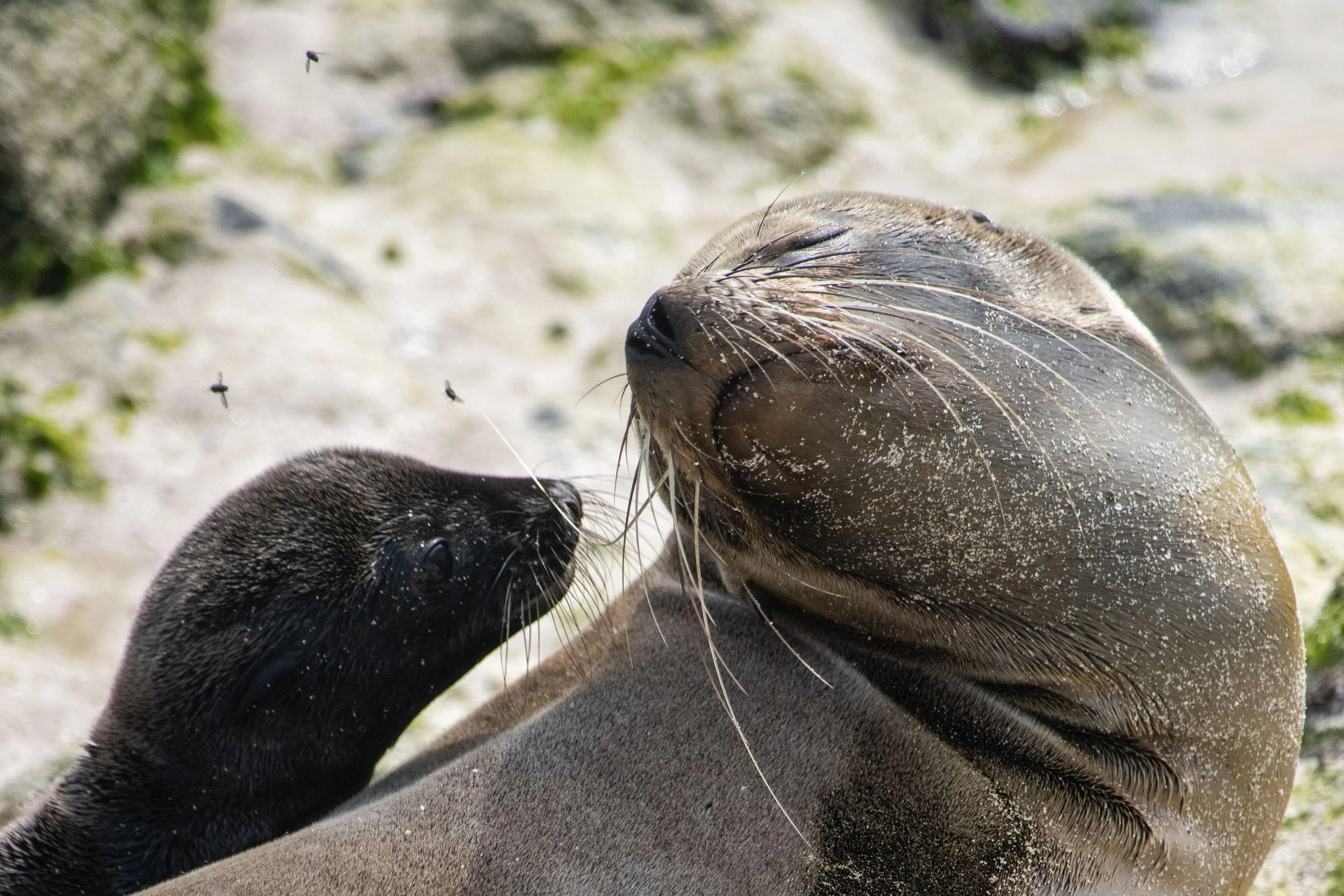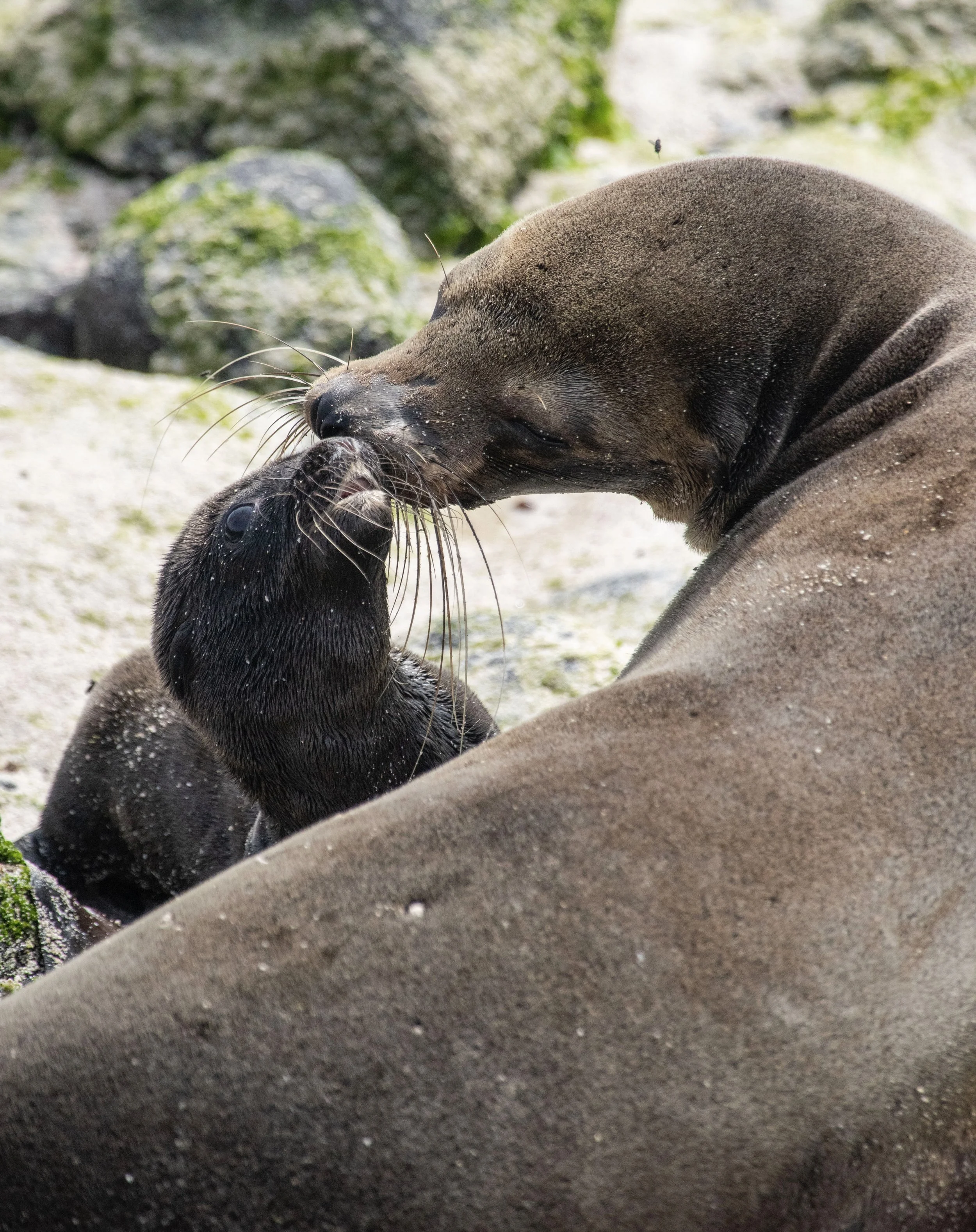 A Galapagos sea lion mother gives its newborn pup a kiss.